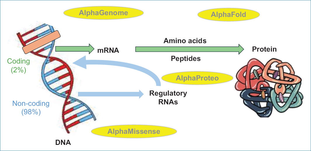 While AlphaMissense targets coding DNA (2% of the genome), AlphaGenome focuses on the remaining 98%, which is regulatory in nature (Lozano-Villalba and Puthanveetti, J Biol Chem 2026) (Fig. 2).
