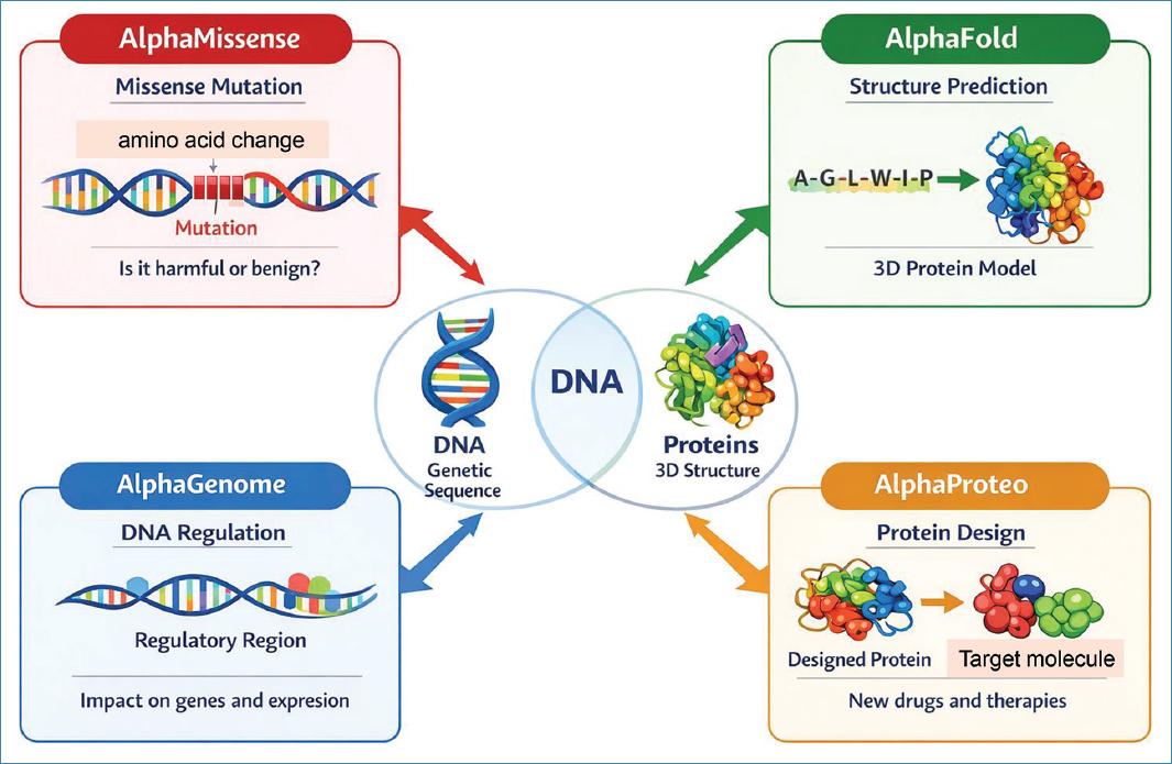 During the last 5 years, Google DeepMind has developed four major biotechnology tools: AlphaFold, AlphaMissense, AlphaGenome, and AlphaProteo.